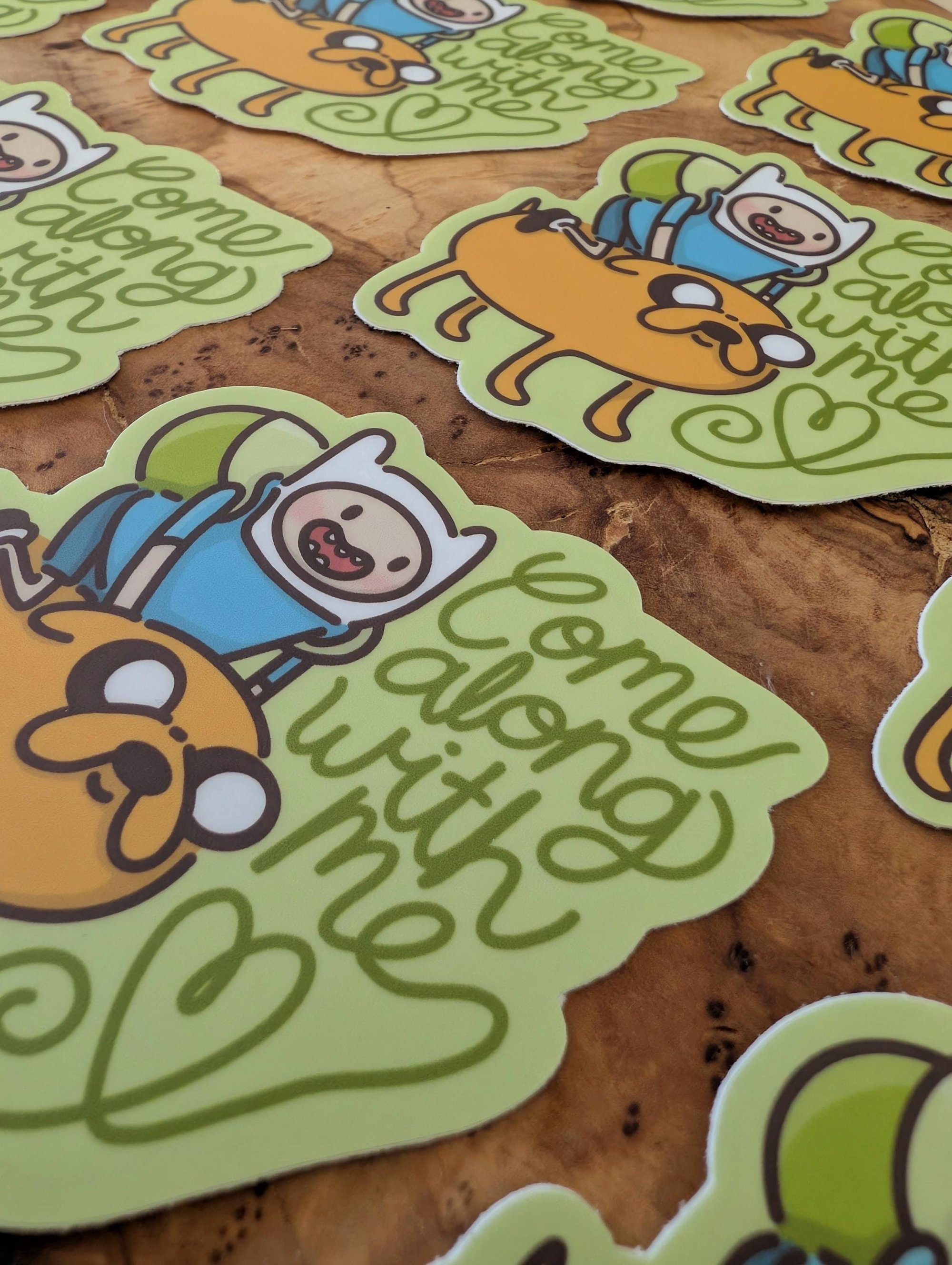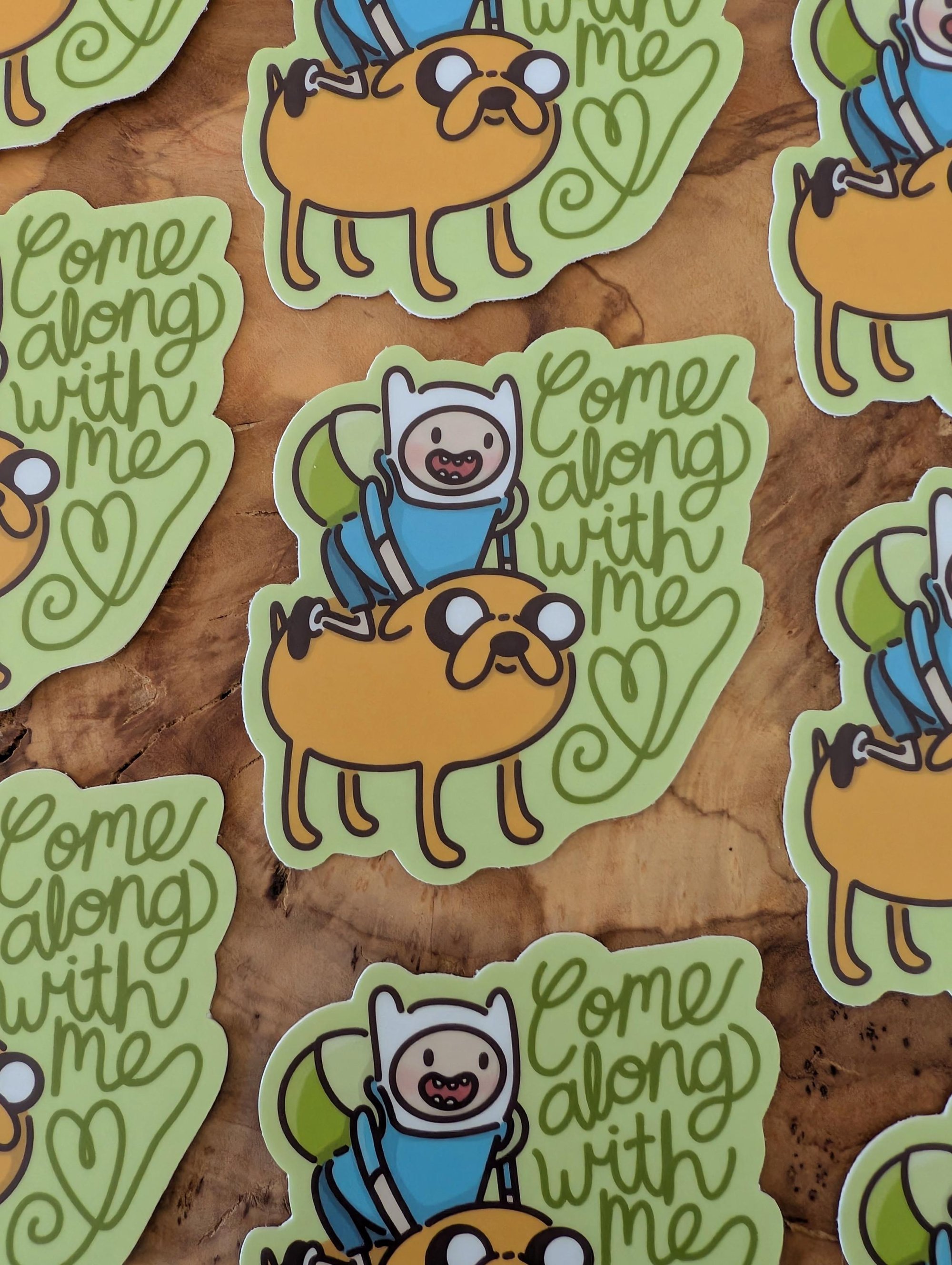 Vinyl laminate sticker of Finn and Jake with the words "Come Along With Me"