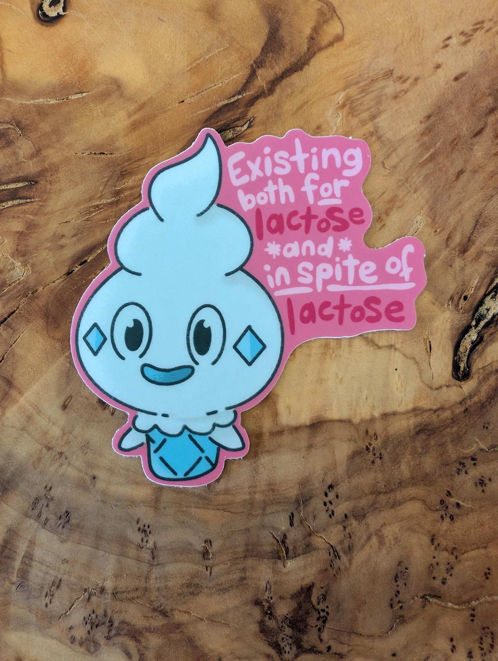 Vinyl laminate sticker of Vanillite with the words "existing both for lactose and in spite of lactose".