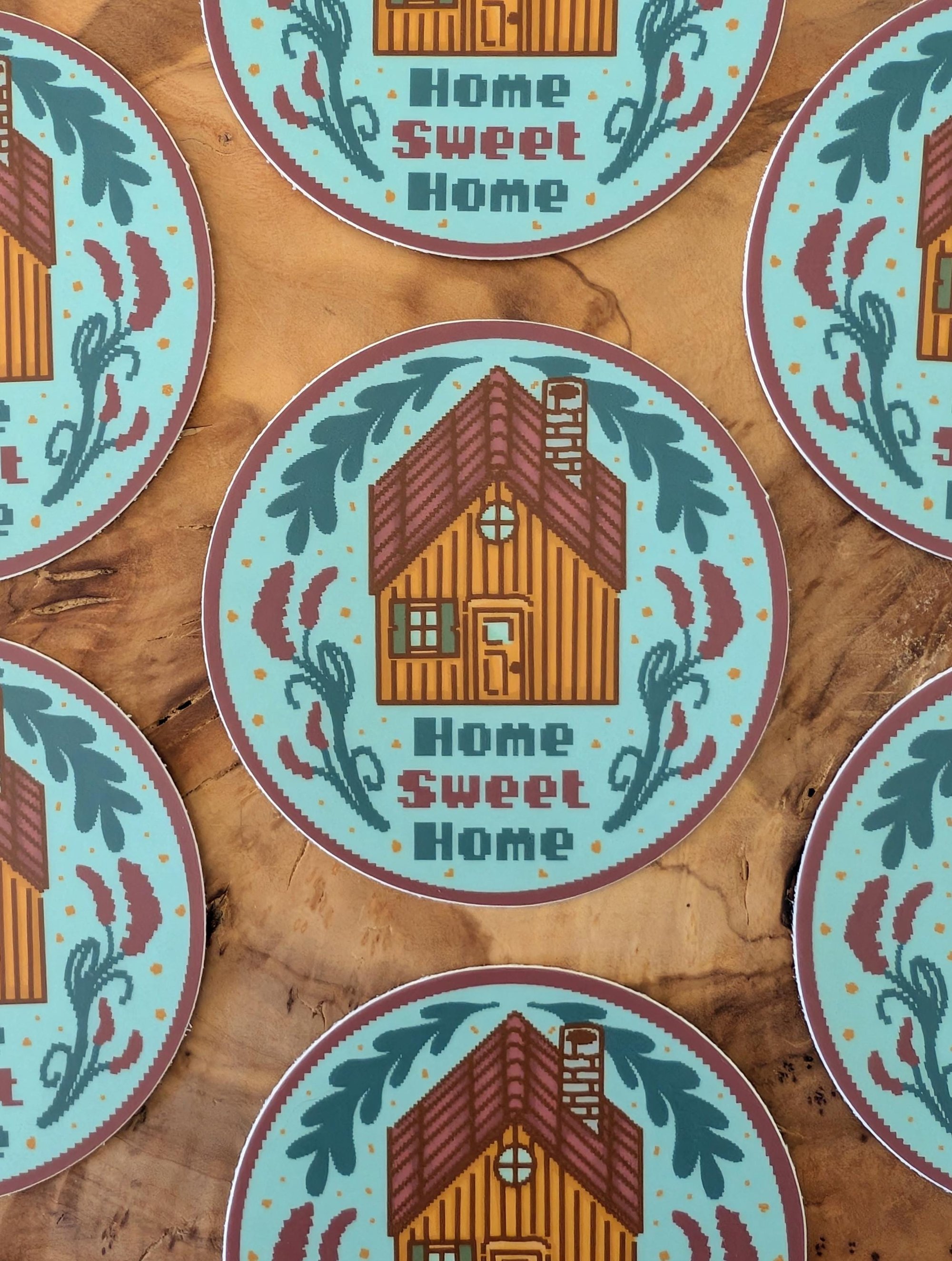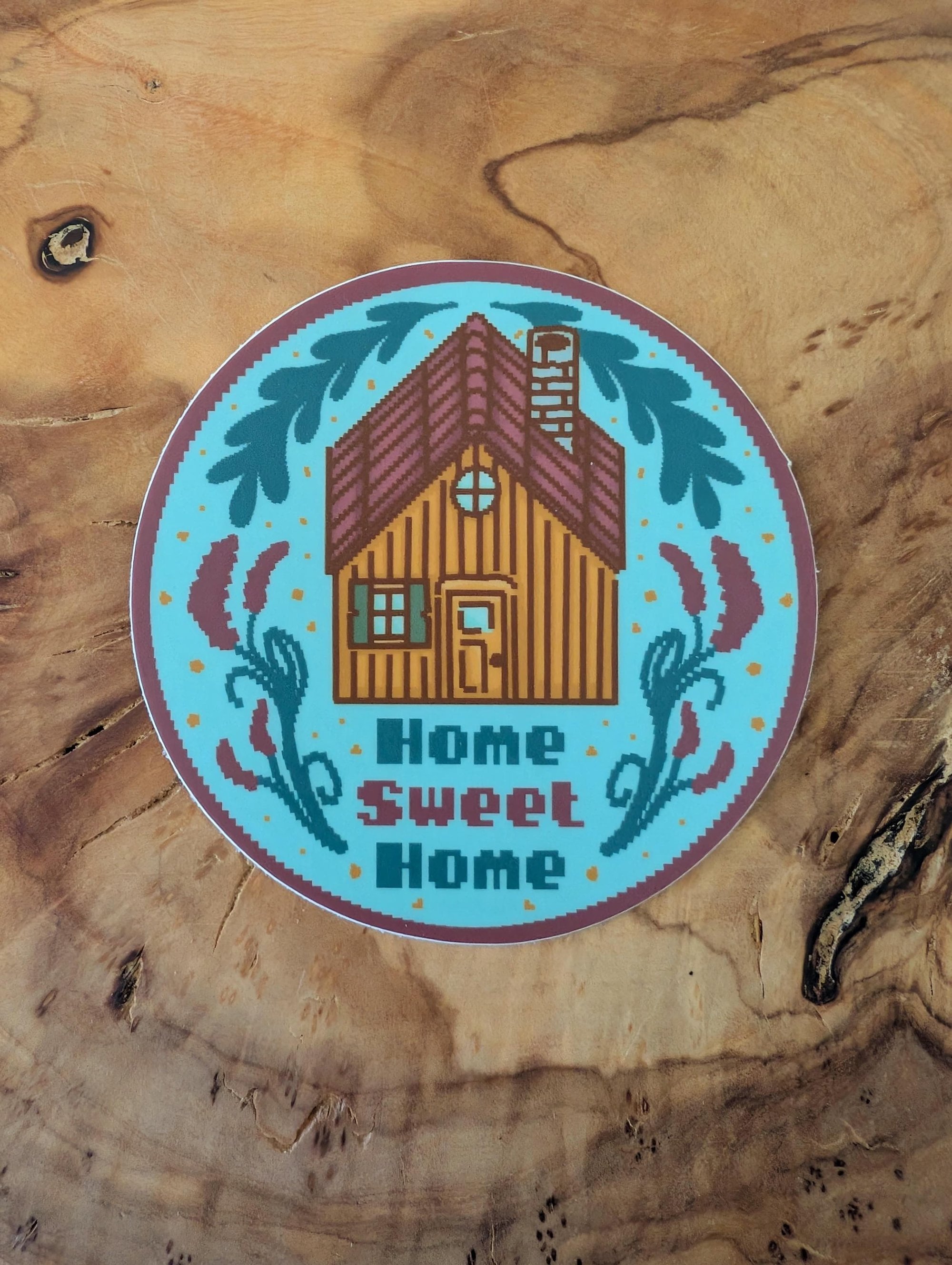 Vinyl laminate sticker of the farm cabin from Stardew Valley with the words "home sweet home".