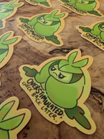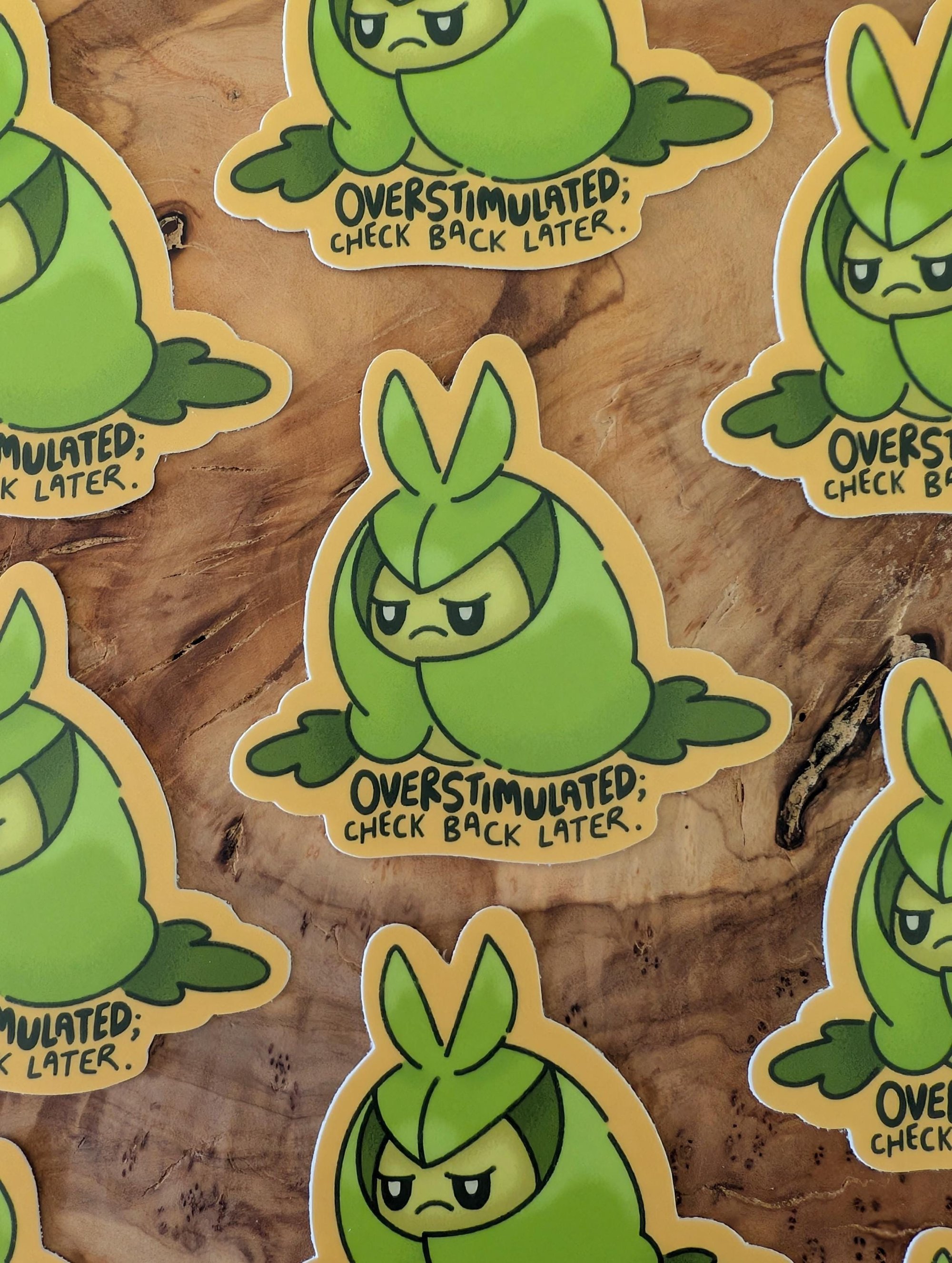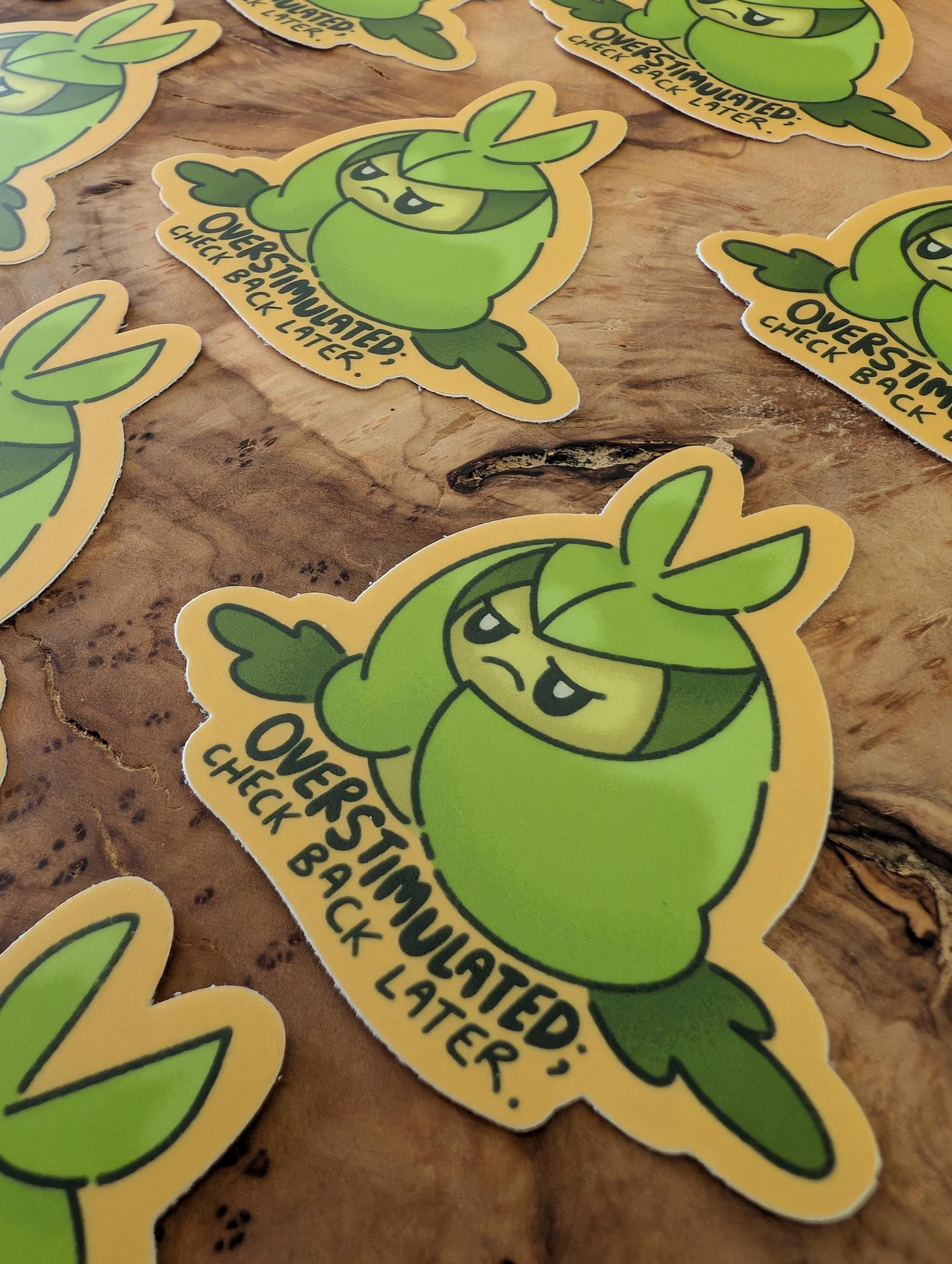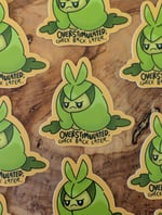 Vinyl laminate sticker of Swadloon with the words "Overstimulated; check back later".