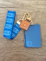 Set of 1 wristlet (approx 5" long) featuring the Lumon logo and 2 epoxy coated resin keychain charms of a Lumon keycard (2.5" tall) and a waffle (1.5" tall)!