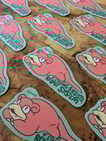 Vinyl laminate sticker of Slowpoke with the words "If staring persists, reboot system"